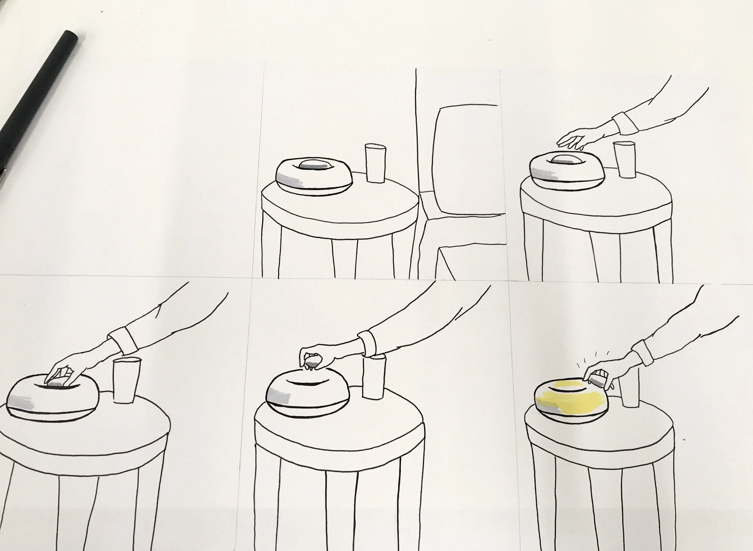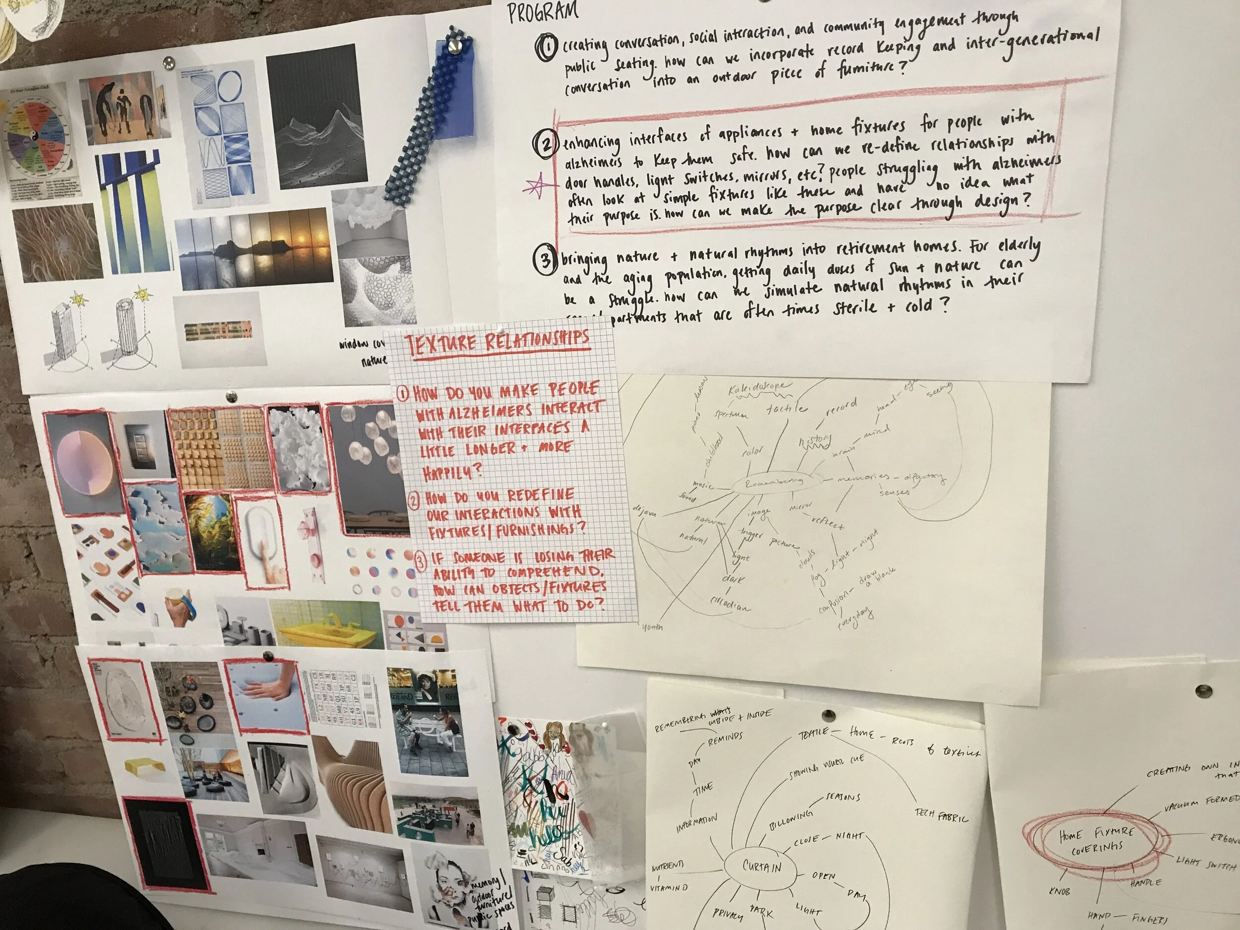 The thought process began with mind maps - one in particular about “remembering.” Key words included: tactile, senses, reflect, everyday, color, circadian, and nostalgia. Many suffering from Alzheimer’s disease may not recognize the simple objects around their home. What if interfaces around the house (buttons, switches, faucets, handles) were no longer indicative of how they operated or their purpose?